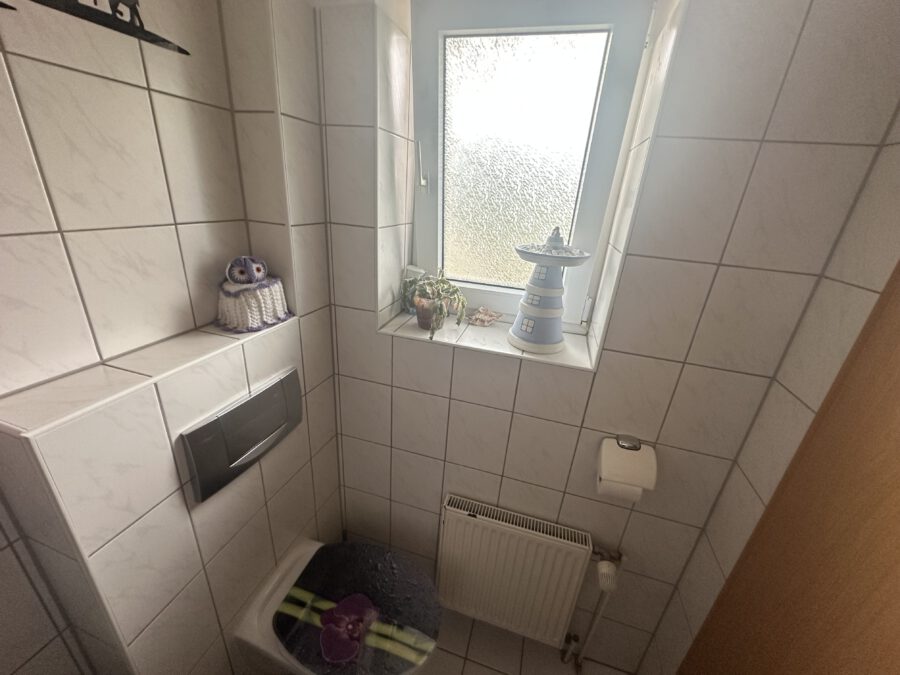 Vom Eingang im Erdgeschoss geht es rechts in ein Gäste-WC mit Fenster.