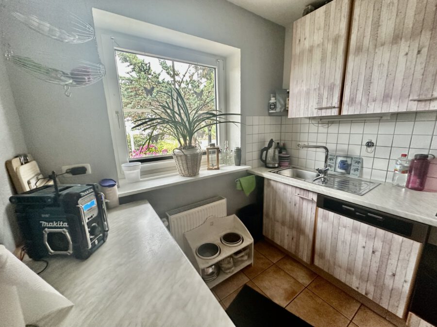Links befindet sich die kleine Küche mit Durchreiche zum Essbereich im Wohnzimmer.