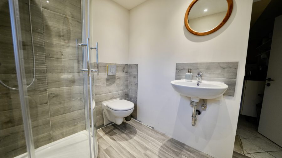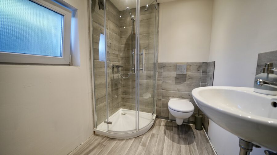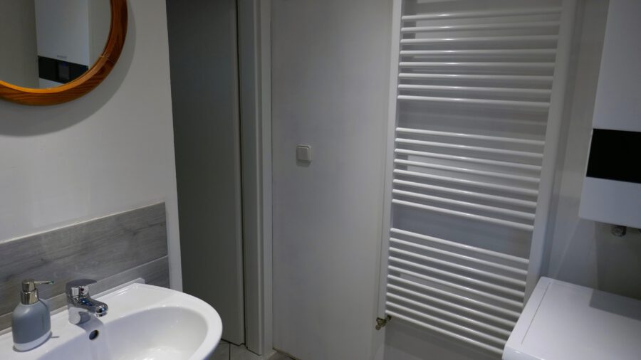 Im neuen Duschbad, mit WC und Handwaschbecken, hat die Buderus Gastherme, über der Waschmaschine, ihren Platz.