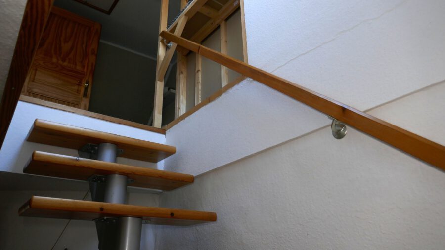 In die obere Etage gelangt man über eine stabile, offene Holztreppe, die sich fast unauffällig in den Raum einfügt.