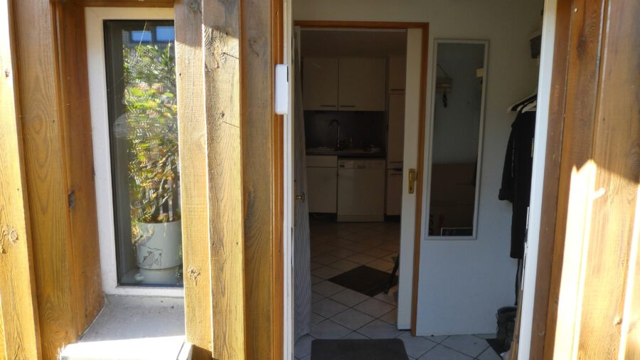 Ein kleiner Flur begrüßt den Besucher und die Schiebetür trennt eine wunderschöne Wohnküche vom Eingang.