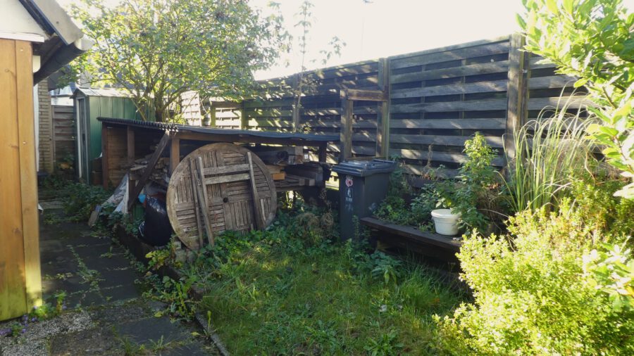 Im Außenbereich steht eine lange Laube mit Fenstern, in der Geräte und Gartenmobiliar Platz finden. Man könnte sie aber zum Beispiel auch als kleine Werkstatt einrichten.