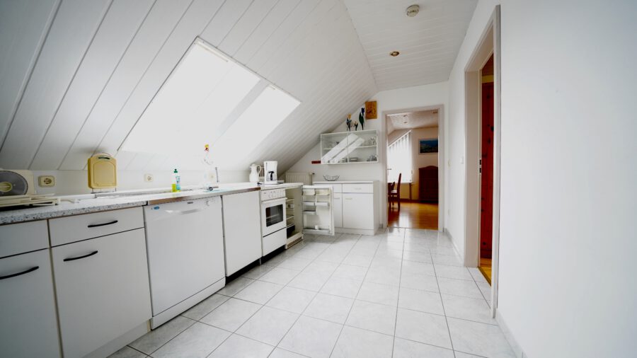 Das Dachgeschoss ist mit einer Küchenzeile im Flurbereich ausgestattet und hat drei Wohnbereiche in unterschiedlicher Größe. Diese Ebene wird durch ein großzügiges Duschbad komplett und eignet sich zu privaten Nutzung.